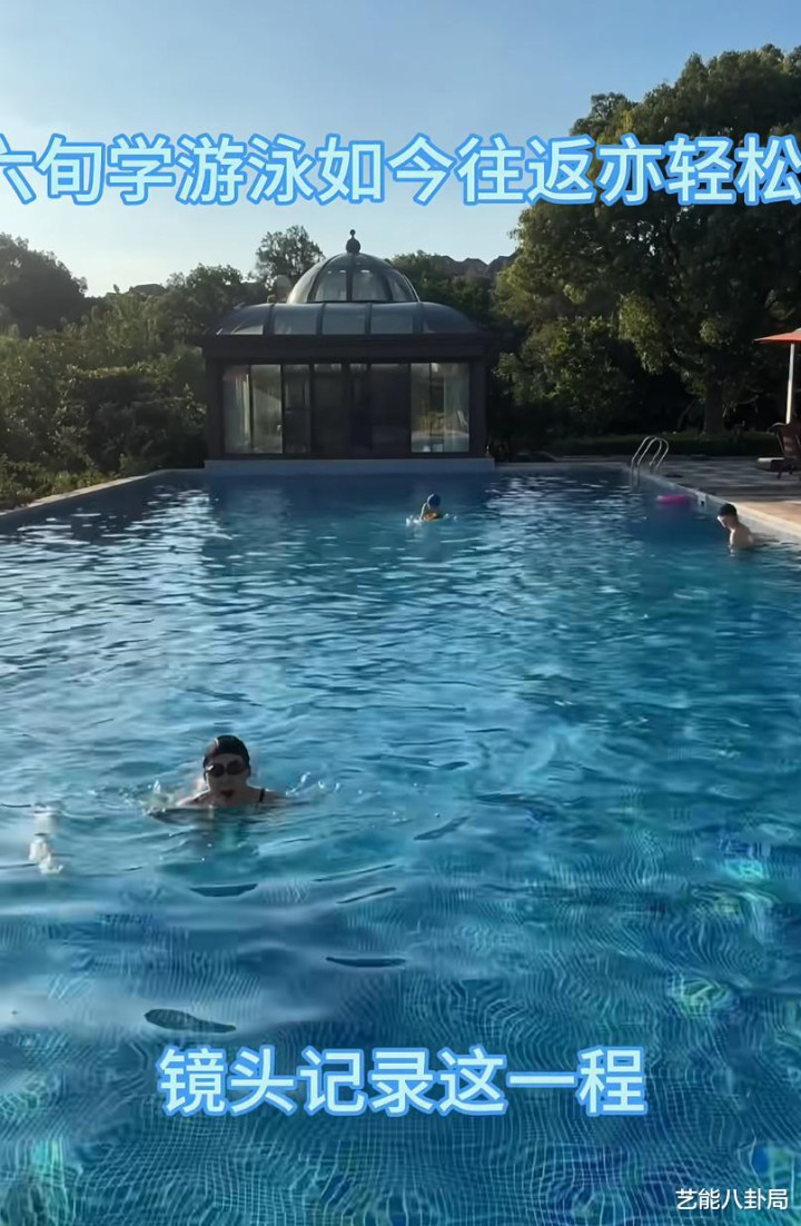 家里有一个25米的泳池,天热的时候她会带着孙子在院子里游水。