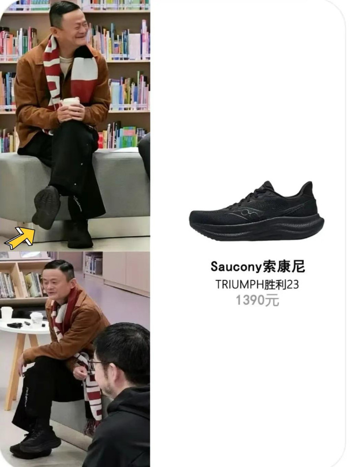 马云翘着二郎腿和蔡崇信等东谈主在聊天,他脚上穿的鞋子是索康尼的,这双千元的玄色洞开鞋鞋型颜面,还显高。
